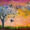Encaustic wax painting – Waterfall with the sun shining through the trees